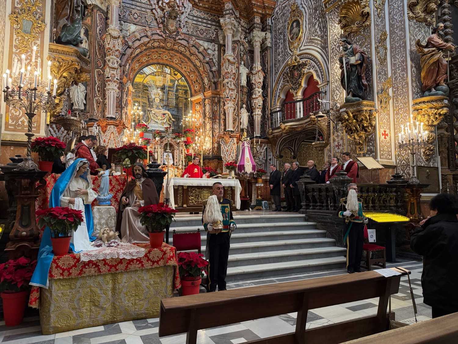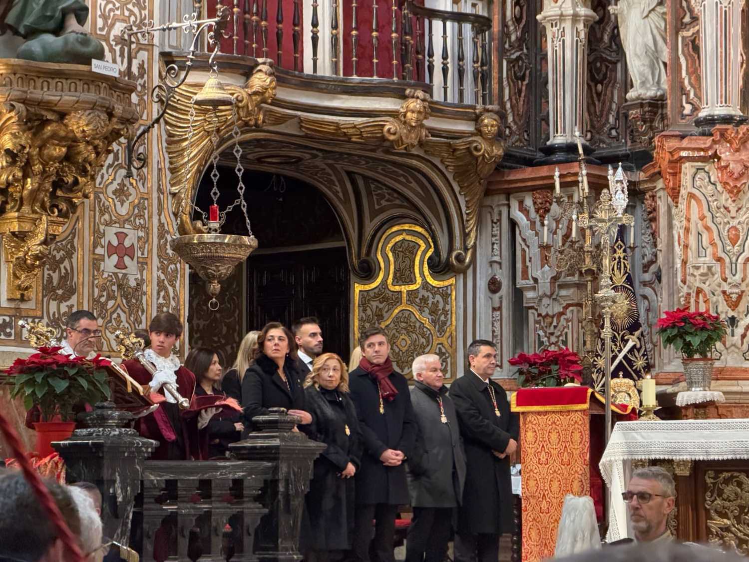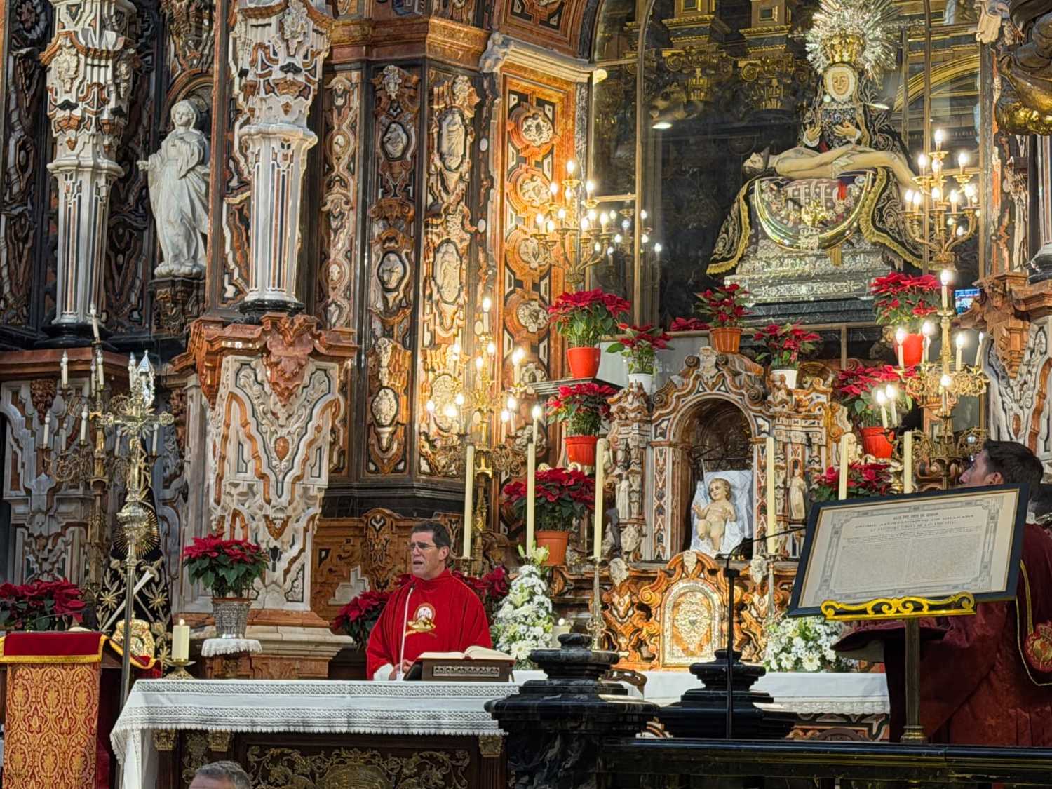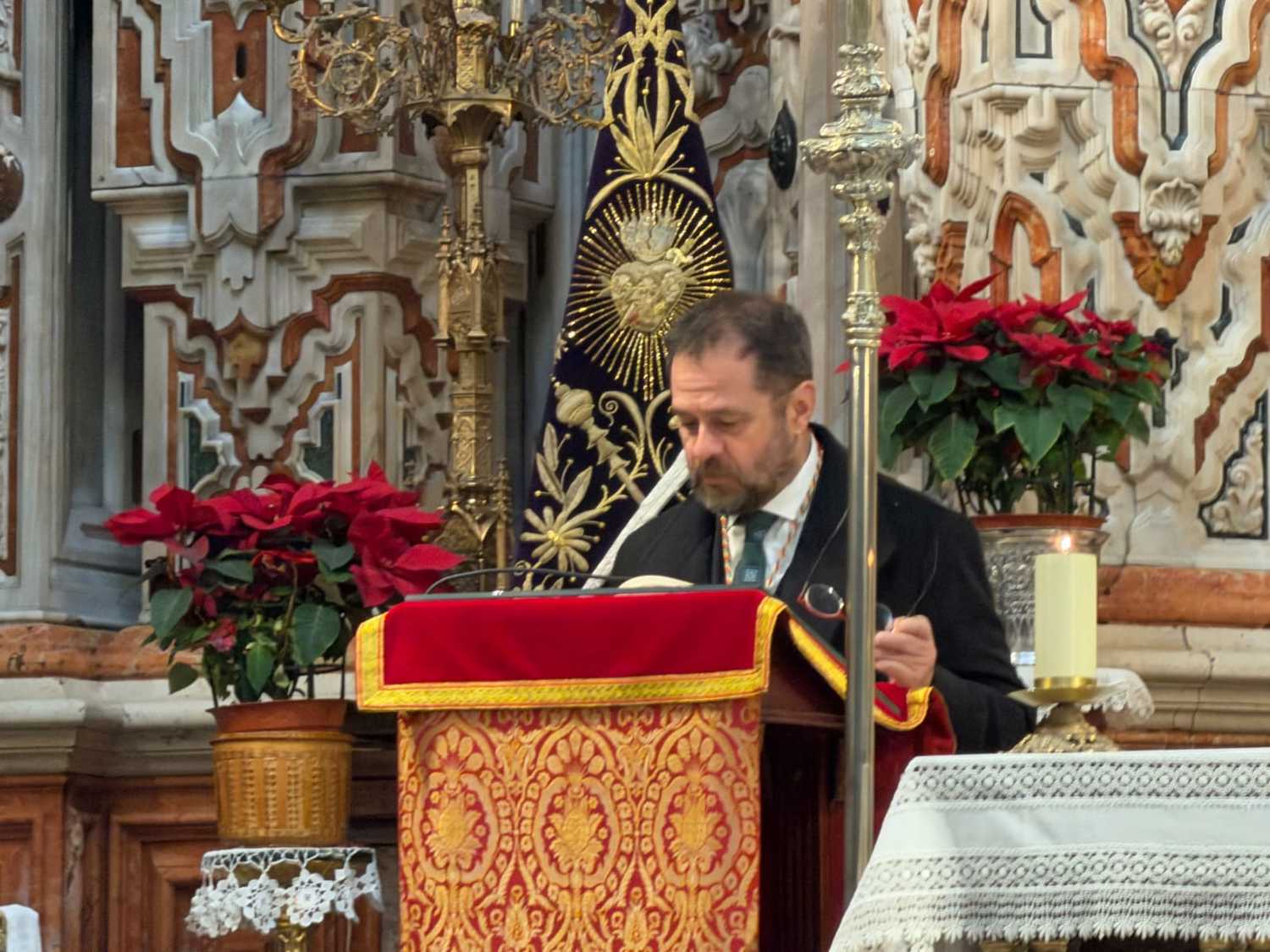 La solemne Eucaristía fue presidida por el Párroco de la Basílica, D. Blas Gerardo Gordo Jiménez. D. Blas dio la Bienvenida a la Corporación Municipal y a todas las personas presentes en esta fecha tan importante para la ciudad de Granada, para darle gracias a la Santísima Virgen de las Angustias, por haberla librado de los efectos calamitosos de los terremotos. En su homilía, D. Blas, empezó con estas palabras: …“Reiterar de nuevo nuestro agradecimiento por vuestra presencia, en representación de toda esta ciudad de Granada, que habéis querido participar en este día, que prolonga la alegría de la Navidad durante toda una semana, y hoy lo hace con esta fiesta de San Esteban, el primero de los mártires cristianos.”… Siguió explicando el Evangelio y cómo San Esteban nos da ejemplo de valor valentía y generosidad, no renunciando de su fe, y entregando su vida por Jesucristo. Terminó con estas palabras: “… Vamos a continuar esta celebración pidiendo también por todos aquellos que tienen esa vocación de servicio público desde la política, para que podáis vivirlo como un ejercicio de la más alta caridad en la búsqueda del bien común, canalizada a través de la acción política, como una forma de practicar el bien. Pero qué importante es cuidarse personalmente y ayudarnos unos a otros para que aprendamos a vernos no desde enfrente, sino en compañía”.