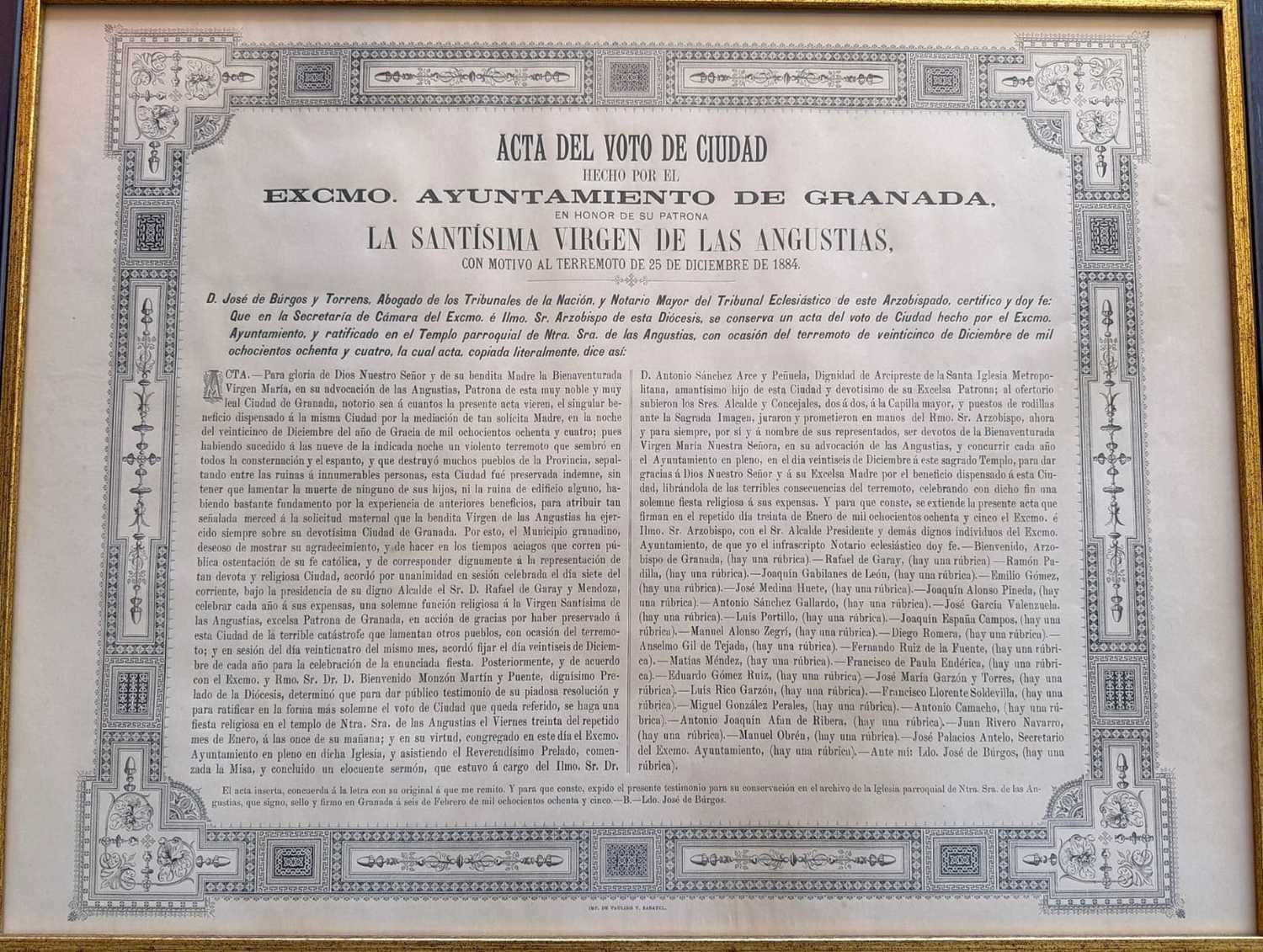 El pasado viernes, día 26 de diciembre de 2025, en la Eucaristía de las 12 horas, tuvo lugar en la Basílica de la Virgen de las Angustias la celebración del VOTO, que la Ciudad de Granada ofrece a la Stma. Virgen, todos los años, desde 1885, por haberla librado de los efectos desastrosos de los terremotos de los años 1884 y 1956.