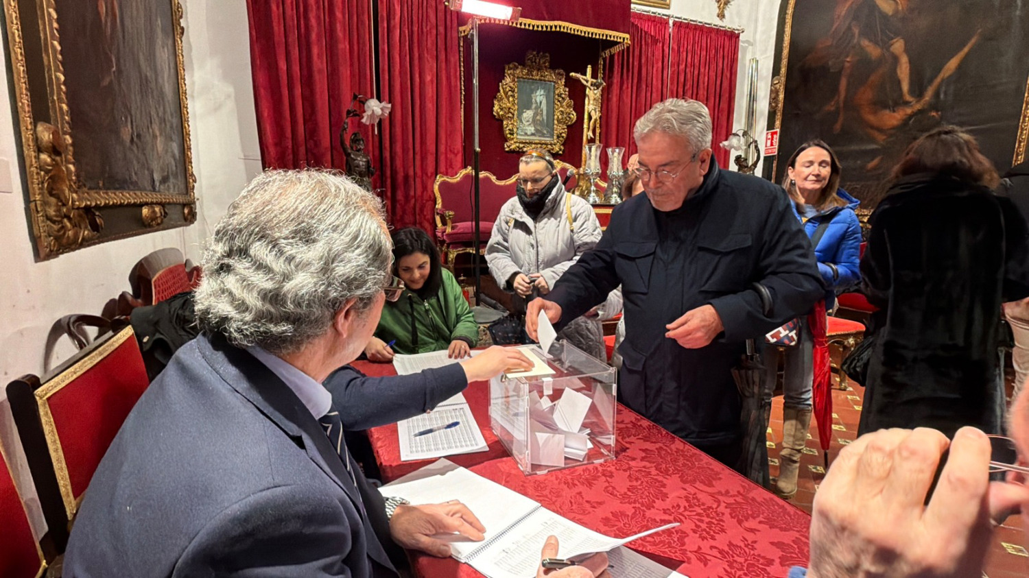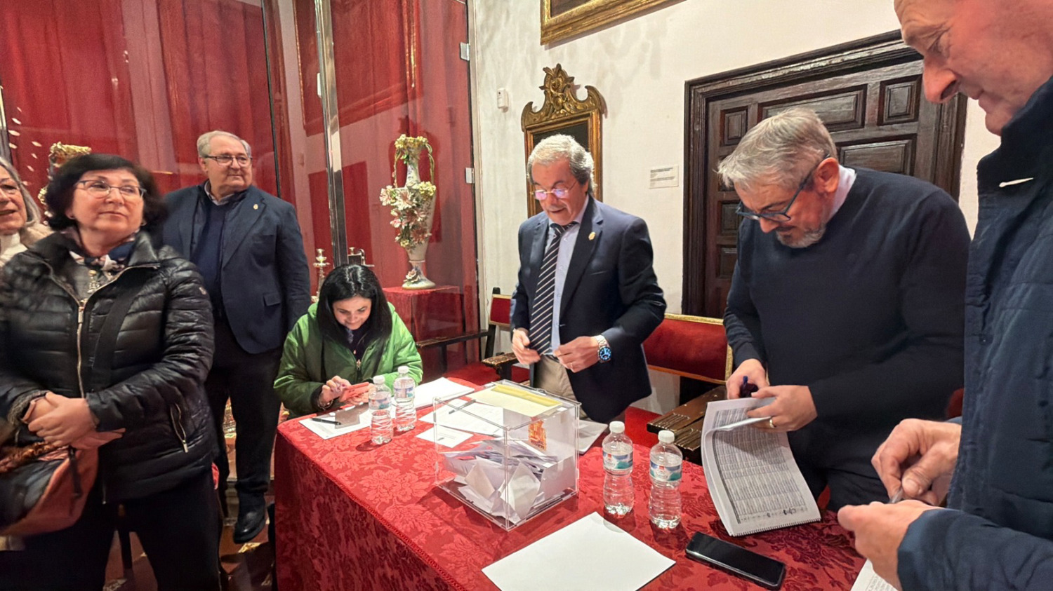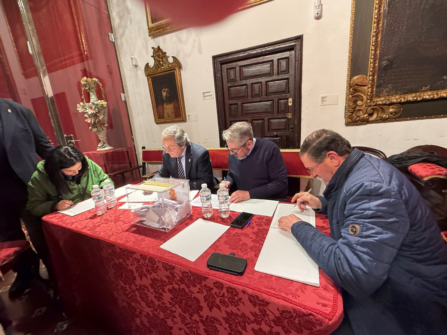 Desde la cinco, la asistencia de los Hermanos con derecho a voto, ha sido constante, sin registrarse ningún incidente, hasta las nueve y media. En una Sala aparte estaban las papeletas oficiales, que cada hermano iba recogiendo para depositarlas en la urna habilitada, previa identificación ante la Mesa Electoral. A las nueve y media se empezó el recuento de votos, una vez abierta la urna. El escrutinio ha sido público, estando la Sala Capitular repleta de hermanos y hermanas de la Hermandad, que lo han seguido con mucho interés, un gran silencio y respeto.